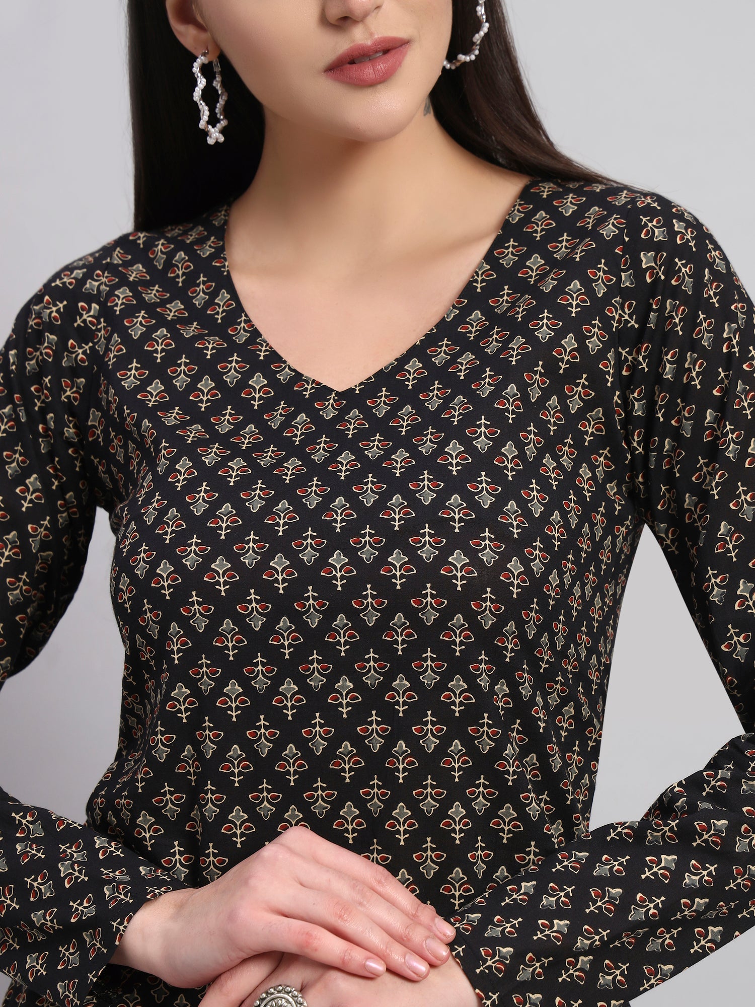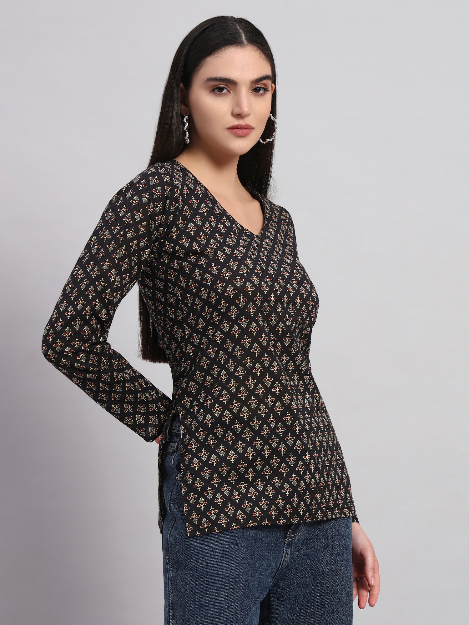 Turn heads effortlessly with this chic-meets-comfy printed kurti. With its sleek V-neck and full sleeves, it blends ethnic charm with everyday sass. Perfect for brunch, college, or coffee runs — this kurti got your vibe . Pair it with jeans, palazzos, or a skirt — it’s giving versatile queen energy.